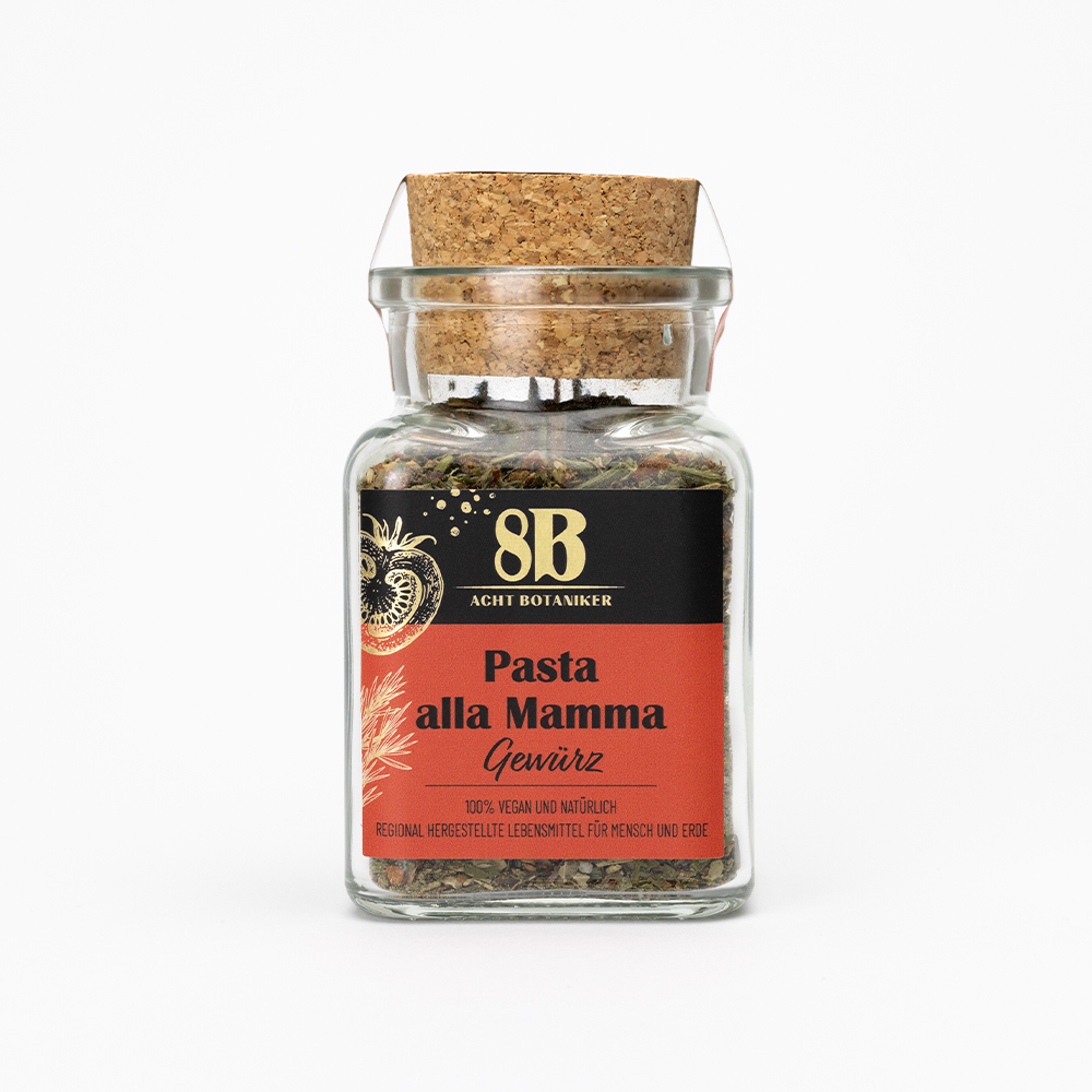 Die 8B Gewürzmischung Pasta alla Mamma ist für allerlei Nudelgerichte Ihrer Wahl einsetzbar. 100% natürliche Gewürzmischung ohne Zusätze. 100% vegan und natürlich, regional hergestellte Lebensmittel.