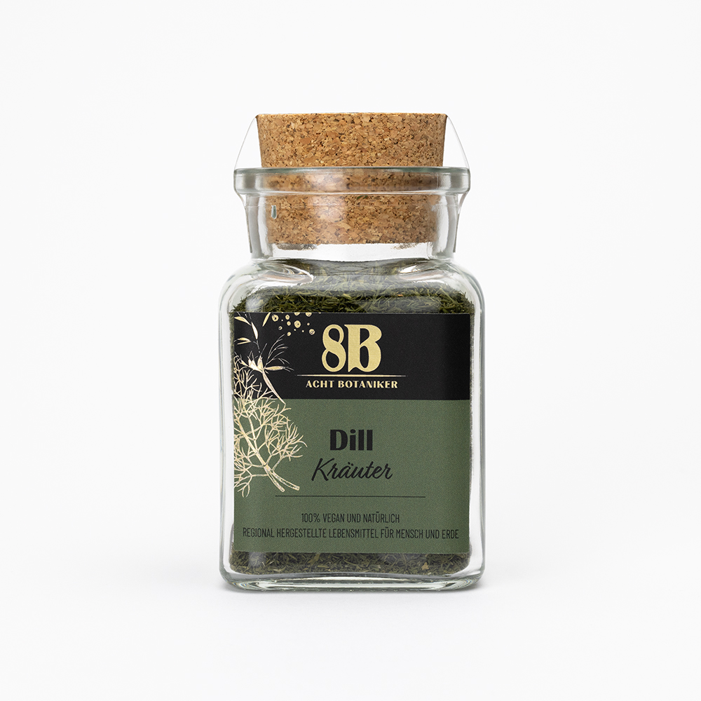 Die 8B Küchenkräuter Dill verleihen Ihrem Gericht eine frische Note und vollen Geschmack! 100% natürliche Gewürzmischung ohne Zusätze. 100% vegan und natürlich, regional hergestellte Lebensmittel.